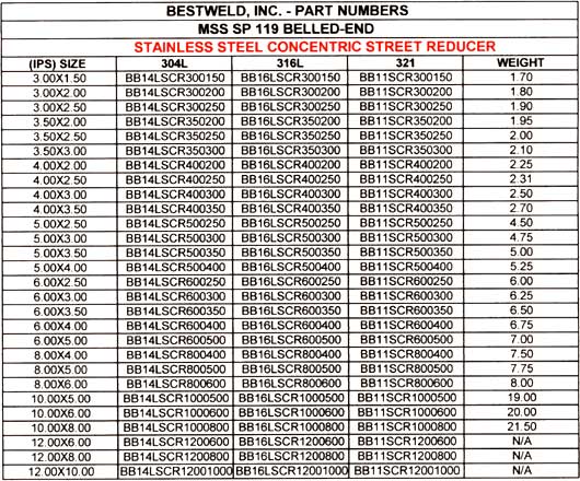 Part Numbers - CONCENTRIC STREET REDUCER - STAINLESS STEEL 3' x 1.5' - 12' x 10'